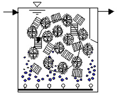 MBBR工藝通過向反應器中投加一定數量的懸浮填料(生物膜載體),在填料的受保護面積上,不同的微生物(從細菌到纖毛蟲再到輪蟲)集中在生物膜上。在載體內部生長一些厭氧菌或兼氧菌,外部為好氧菌。每個載體都是一個微型反應器,在好氧處理系統(tǒng)中通過鼓風曝氣,或者在厭氧處理系統(tǒng)中通過攪拌作用下,保證廢水與生于載體上的生物膜廣泛而頻繁地接觸。提高系統(tǒng)傳質效率的同時,強化生物膜微生物的更新,保持和提高生物膜的活性。懸浮載體與原有活性污泥形成更為復雜的復合式生態(tài)系統(tǒng),附著生長在載體上的生物膜使反應器中活性生物量大大增加。在懸浮活性污泥與懸浮載體表面的生物膜共同作用下,大大提高系統(tǒng)的抗沖擊負荷能力,達到提高污水處理的效能和穩(wěn)定出水水質的能力。